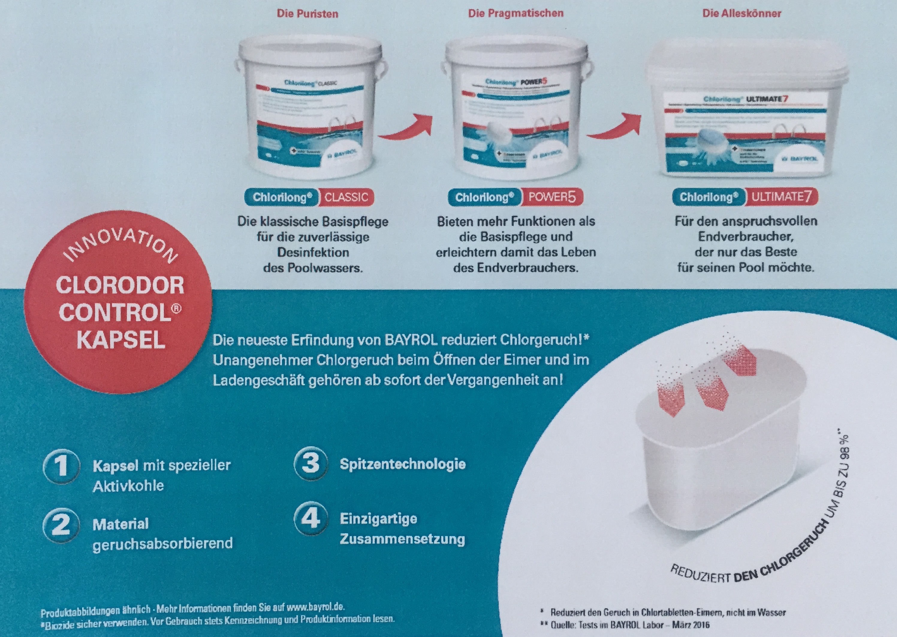 ACHTUNG - In der 1 kg Dose e-Chlorilong® POWER 5 ist keine Control® Kapsel enthalten - Nur in den 5 kg Eimern. NEU - Jetzt mit Clorodor Control® Kapsel*. - Die neueste Erfindung von Bayrol reduziert den Chlorgeruch durch eine einzigartige Zusammensetzung. Die Clorodor Control® Kapsel besteht aus atmungsaktiver Kohlefaser, welche geruchsabsorbierend wirkt und den Chlorgeruch im Eimer bis zu 98% reduziert. Unangenehmer Chlorgeruch beim Öffnen der Eimer und in Lagerräumen gehören ab sofort der Vergangenheit an (*Reduziert den Geruch in Chlortabletten-Eimern, nicht im Wasser). Je Eimer ist eine Clorodor Control® Kapsel enthalten.
